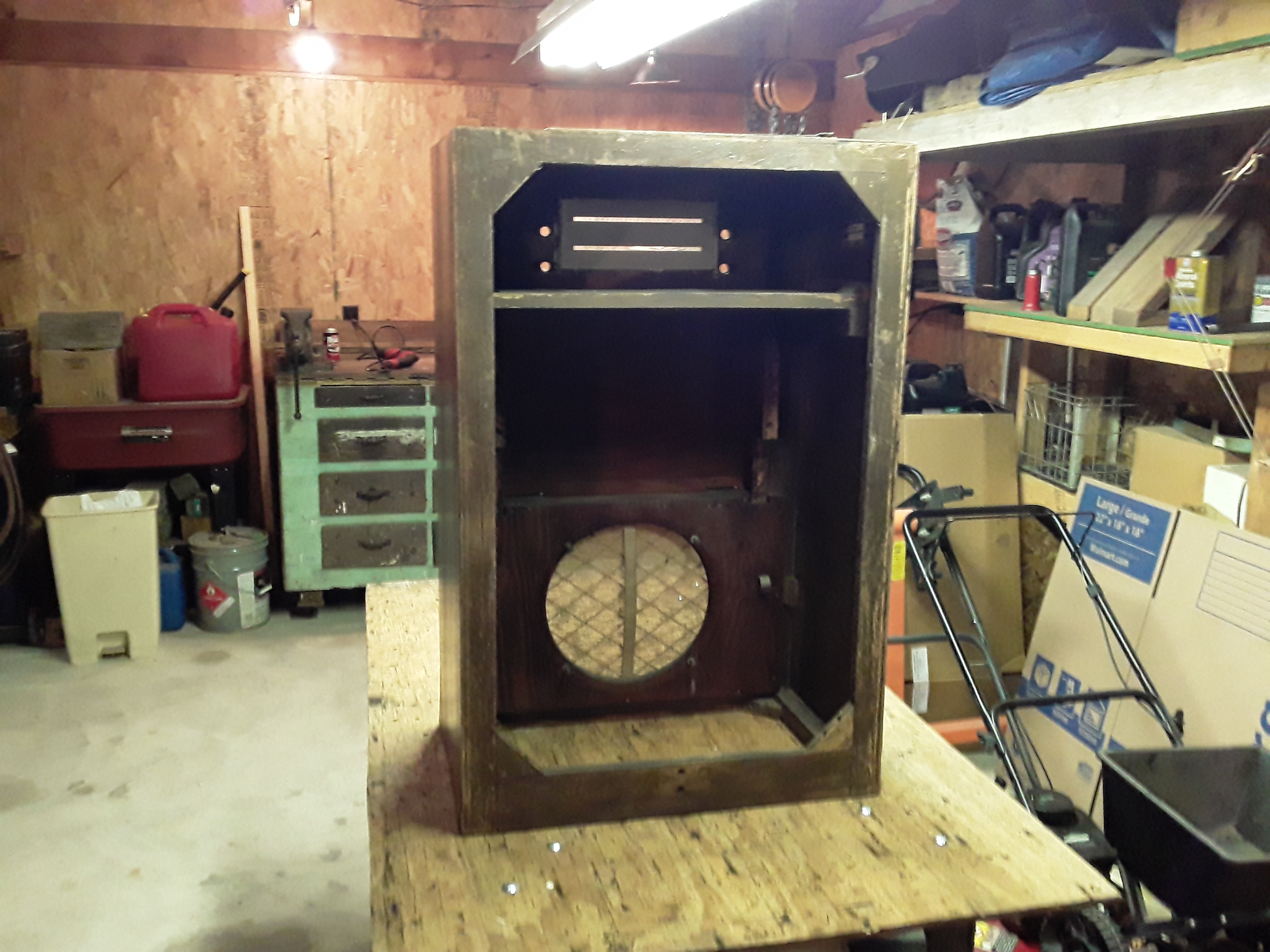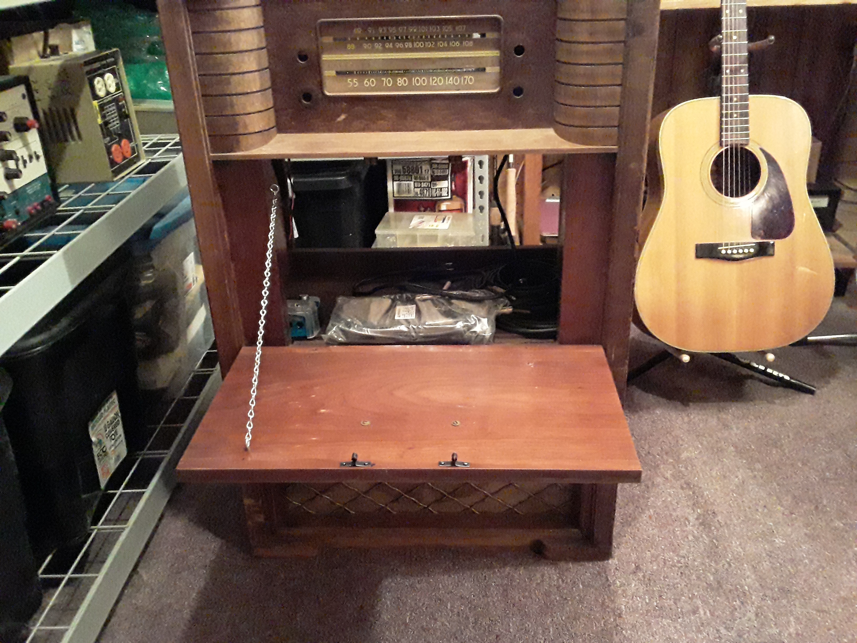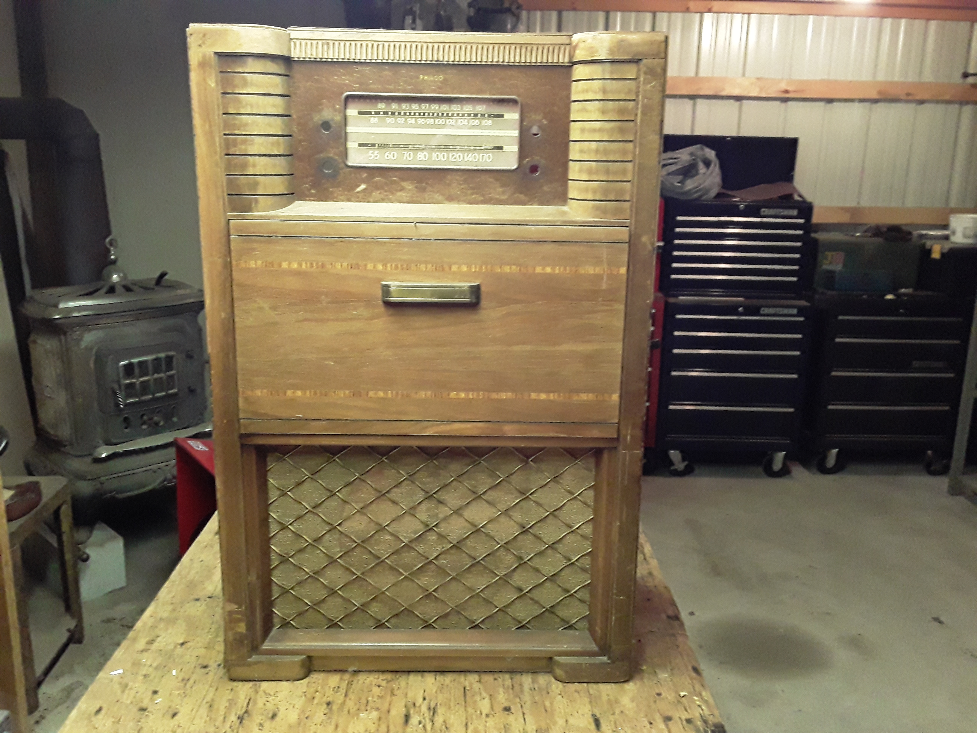 Philco radio console cabinet. I have worked on the cabinet some, adding a shelf where the phonograph