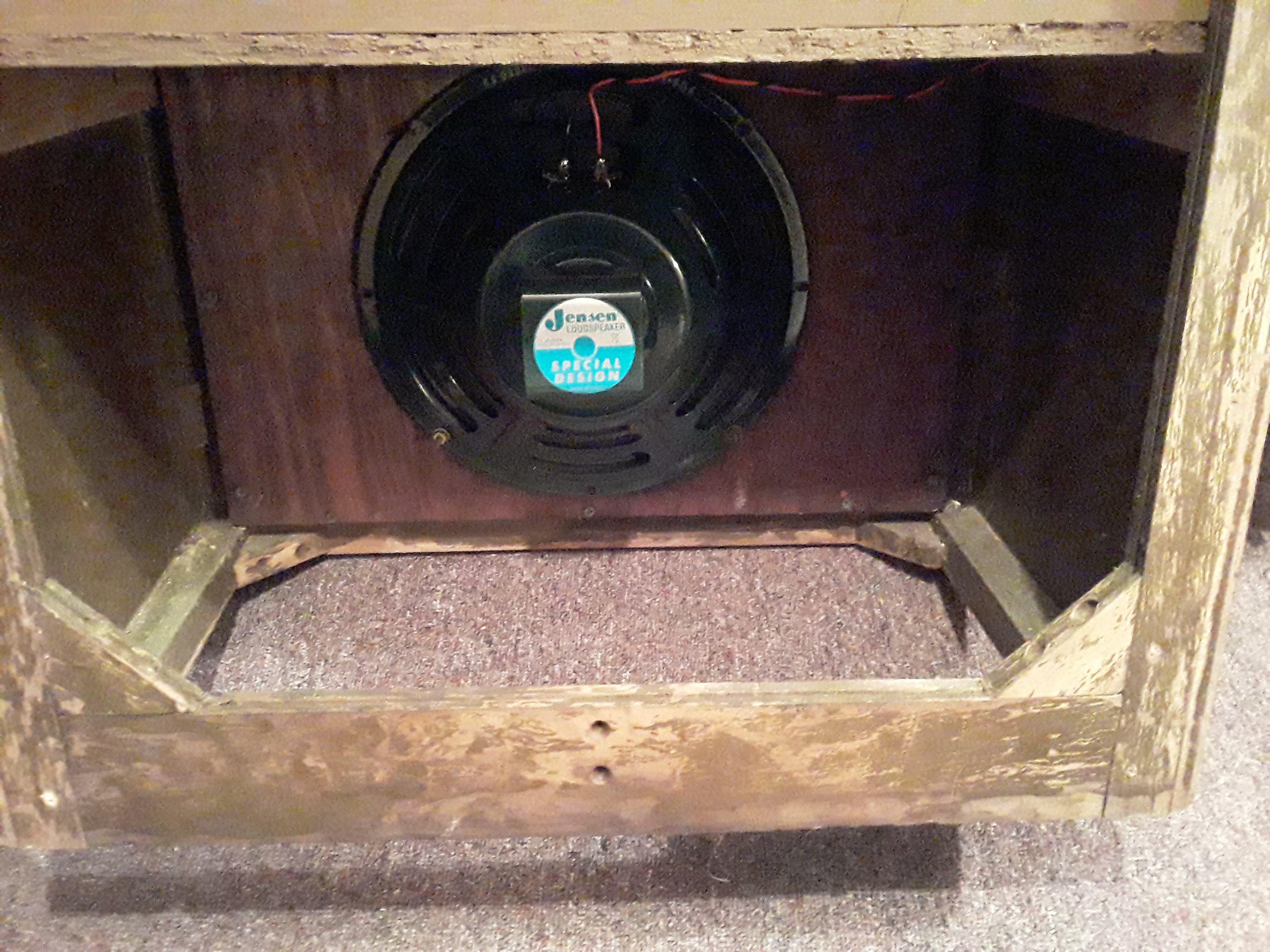 latches installed on the (former) phonograph door. Jensen speaker installed. Pilot light lampholder and red