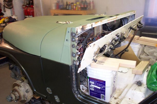 Since the last entry in March, the driver's side sheet metal has been cut out and removed; tail light to firewall. All rust through in that area has been cut out and metal patches welded in and POR'd. The cowl, hood and grille have been stripped and etch primed. Inside the rear fender wells have been under- coated. The replacement metal panel has been fitted and is clamped in place ready for welding. The grille has been reinstalled and the new fenders are being trial fitted and along with the hood. Stayed tuned.