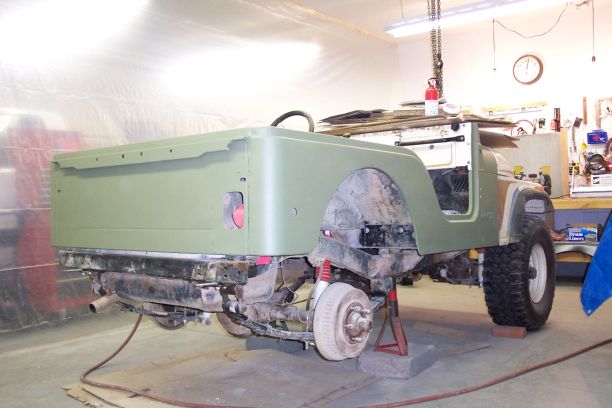 Passenger side quarter panel and tailgate have had paint stripped, rust patches welded in, bondo added and smoothed out, bare metal sanded, and painted with etch primer.